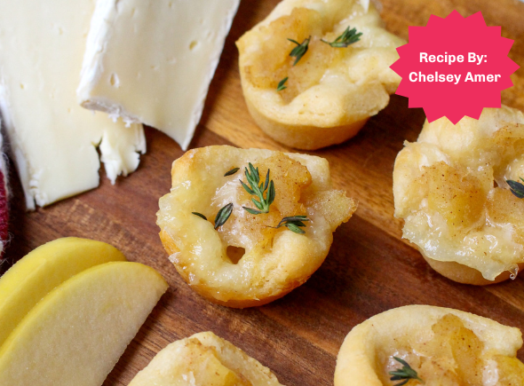 Roll out the crescent dough and cut it into 24 small squares, about 1.5-inch x 1.5-inch. Press each square into the prepared mini muffin tin. Add 1 cube of brie to each muffin tin. Top with the apple compote.